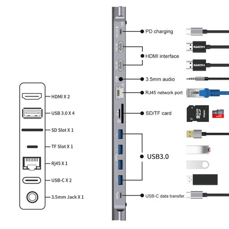12-in-1 USB-C Hub: HDMI, USB 3.0, SD/TF, RJ45, Audio, PD Charging
